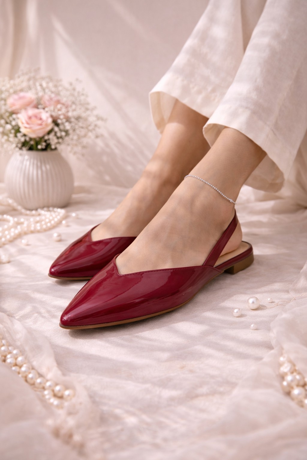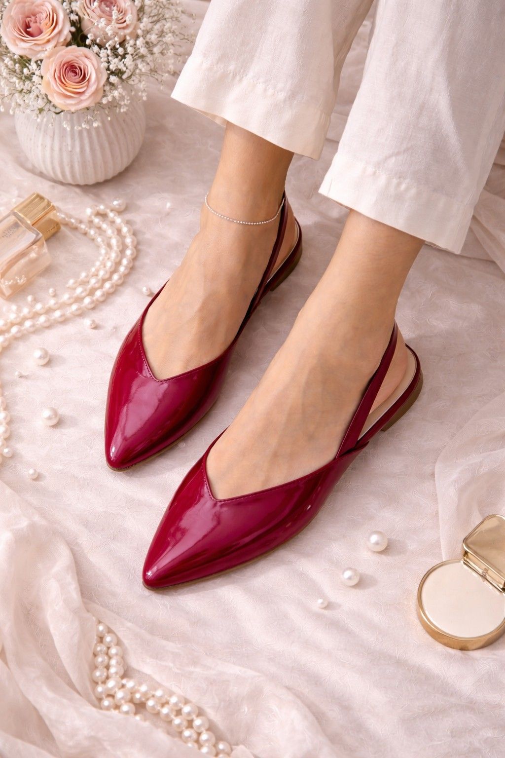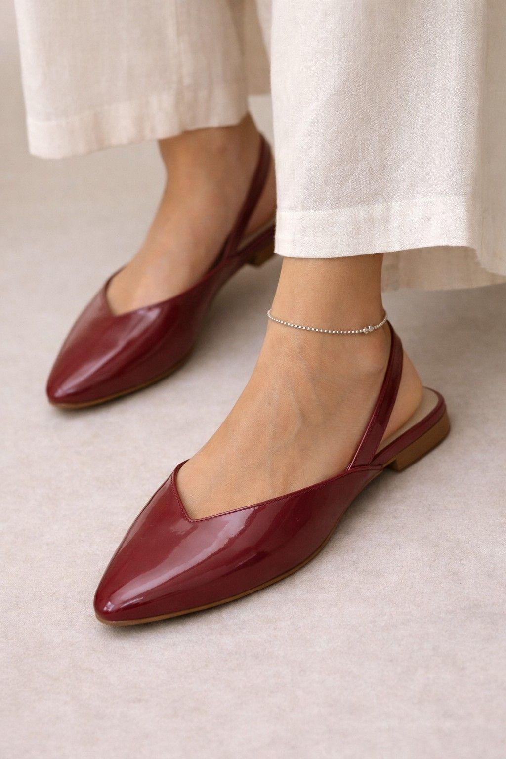 Amarena is a vegan red leather slingback designed in a deep wine-red tone for bold elegance. Its glossy finish, pointed silhouette, and minimalist cut bring an Italian-inspired sophistication. It’s perfect for festive looks